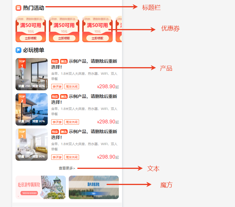 POI地址:用于選擇帶有地址的商品(景點(diǎn)、酒店、露營、美食),一個(gè)組件僅支持一個(gè)商品,支持設(shè)置布局樣式。