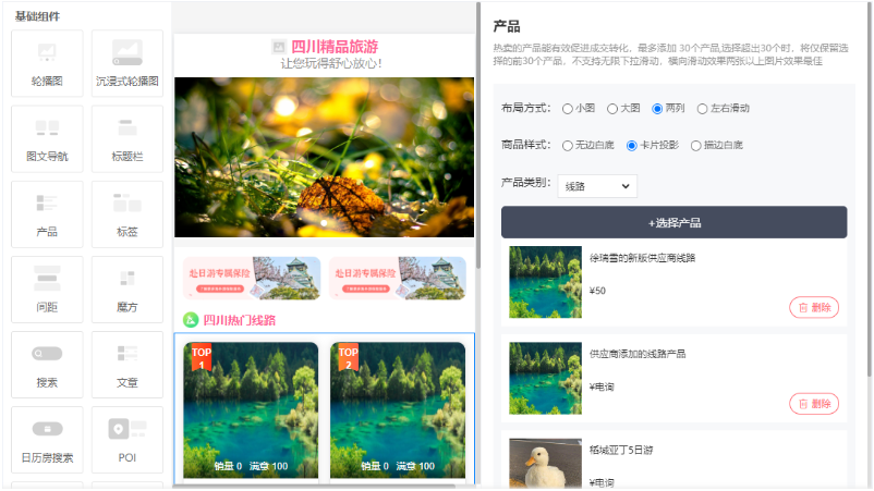 產(chǎn)品:產(chǎn)品編輯組件,最多支持添加30個(gè)產(chǎn)品,超出則保留選擇的前30個(gè)產(chǎn)品,支持設(shè)置布局方式、商品樣式、產(chǎn)品類型。