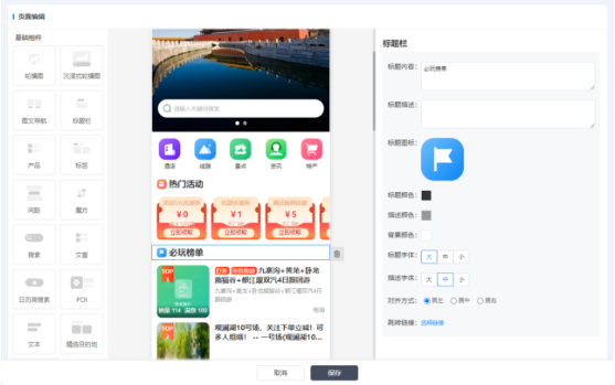 標(biāo)題欄:設(shè)置標(biāo)題內(nèi)容、描述、圖標(biāo)、顏色、字體大小、對(duì)其方式、跳轉(zhuǎn)鏈接,若標(biāo)題無需描述,則不填內(nèi)容。
