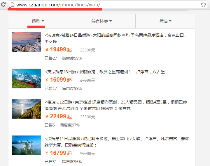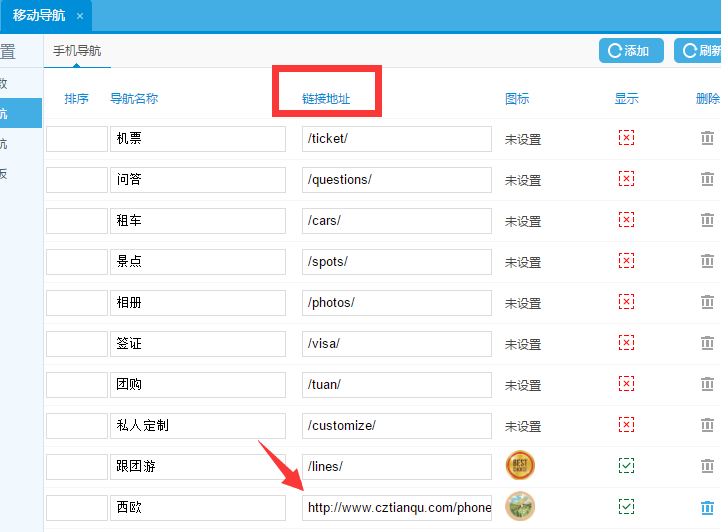 主導航添加成功后,需要加上有效的鏈接地址才能夠進行頁面的跳轉。比如:添加一個西歐的主導航,鏈接地址就需要您在移動版網站前臺,搜索找到西歐這個目的地,然后復制這個頁面的鏈接到移動導航的鏈接地址上面,這樣點擊西歐這個主導航,才能跳轉到關于西歐的產品頁面。(鏈接是需要移動版鏈接)