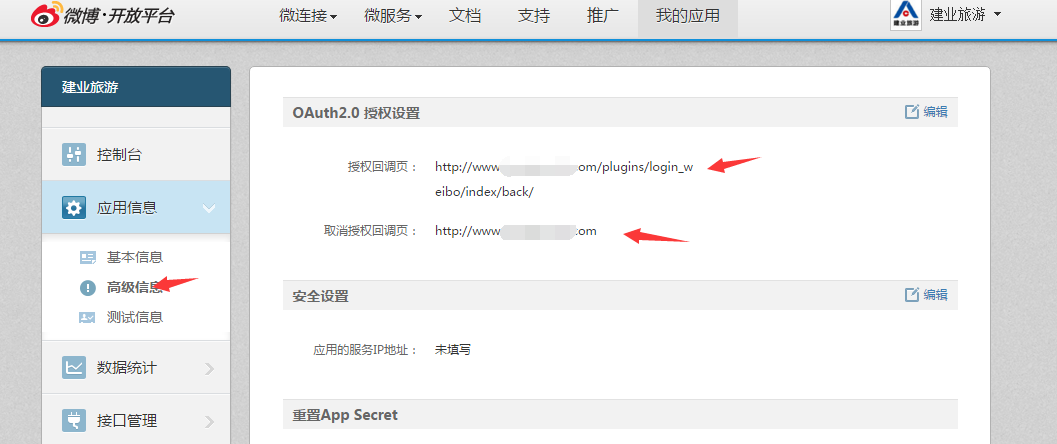 微博授權(quán)回調(diào)地址填寫見下圖箭頭指向的.涂改部分填寫自己的網(wǎng)站域名即可. 授權(quán)回調(diào)頁:http://www.xxx.com/plugins/login_weibo/index/back/