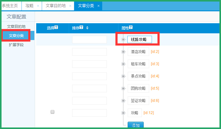 產品與文章系統是至關重要的,其中包含此次旅游前往的目的地,以及相關優惠推薦和詳細介紹。文章系統的目的地屬性設置步驟如下圖: