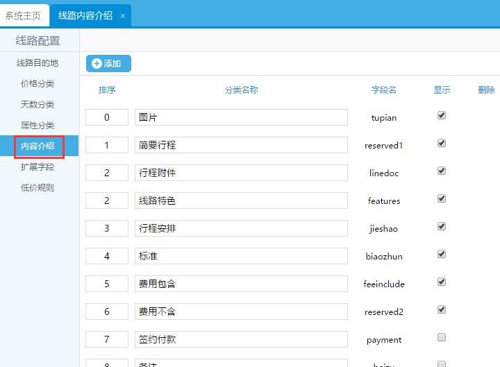 2.在上圖的操作界面可以對線路產(chǎn)品信息的內(nèi)容分類名稱進行編輯和整理。具體操作解釋如下: