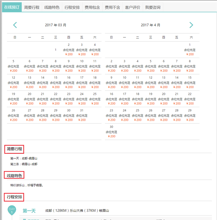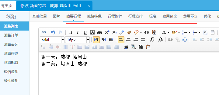 3、設置好內(nèi)容介紹之后,在編輯線路產(chǎn)品時會出現(xiàn)相應的分類,填充完成前臺就會按設置的排序進行展現(xiàn)。