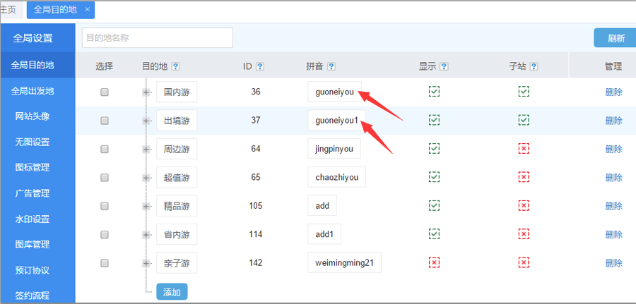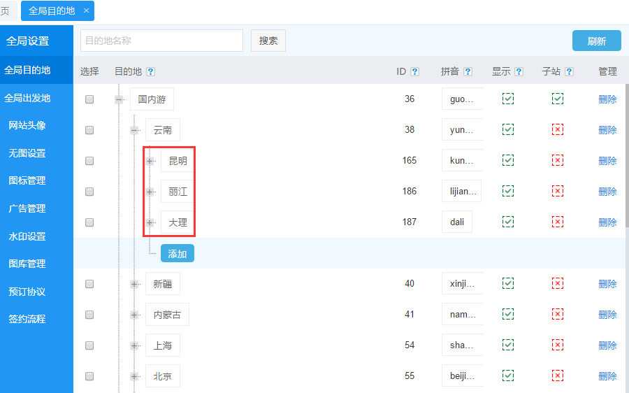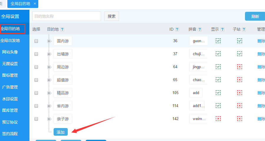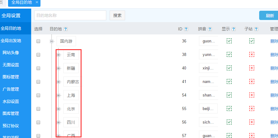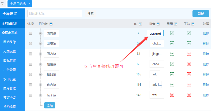 注意:只有全局目的地才有新增,修改和刪除功能,其它版塊的目的地只能選擇開啟或者關閉以及顯示和熱門等功能。