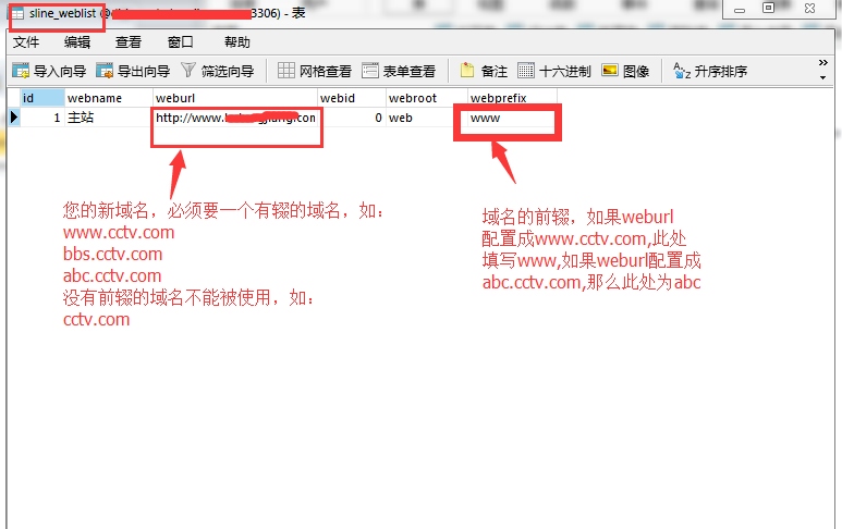 3、打開(kāi)數(shù)據(jù)庫(kù)的sline_weblist表,修改方式請(qǐng)參照下圖: