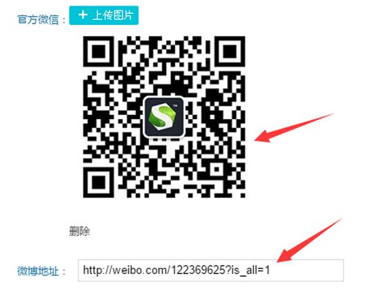 上傳官方微信二維碼的圖片、填寫微博的地址,在前臺客服欄目中可以進(jìn)行掃描和跳轉(zhuǎn)