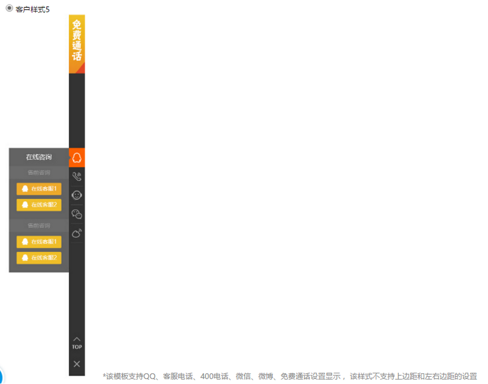 (5)客戶樣式5:支持QQ客服、客服電話、400電話、微信二維碼、官方微博、以及免費(fèi)電話的顯示,點(diǎn)擊TOP可以 回到頂部