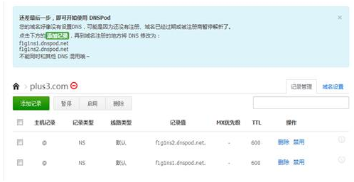 7、在域名記錄管理界面,點擊【添加記錄】,添加您需要解析的記錄即可