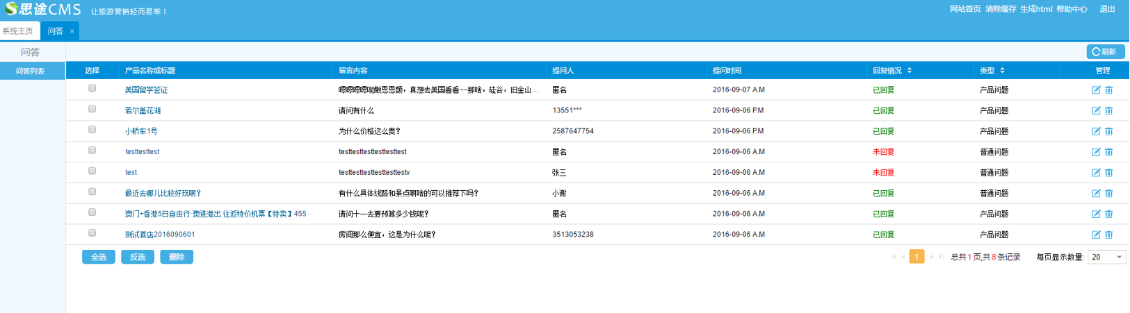 支持問答回復,支持查看用戶信息,IP,支持查看用戶提問發起頁面,支持為問題設置目的地分類;支持按年月周、管理問答,支持批量刪除,人工省核,支持為問答加分。
