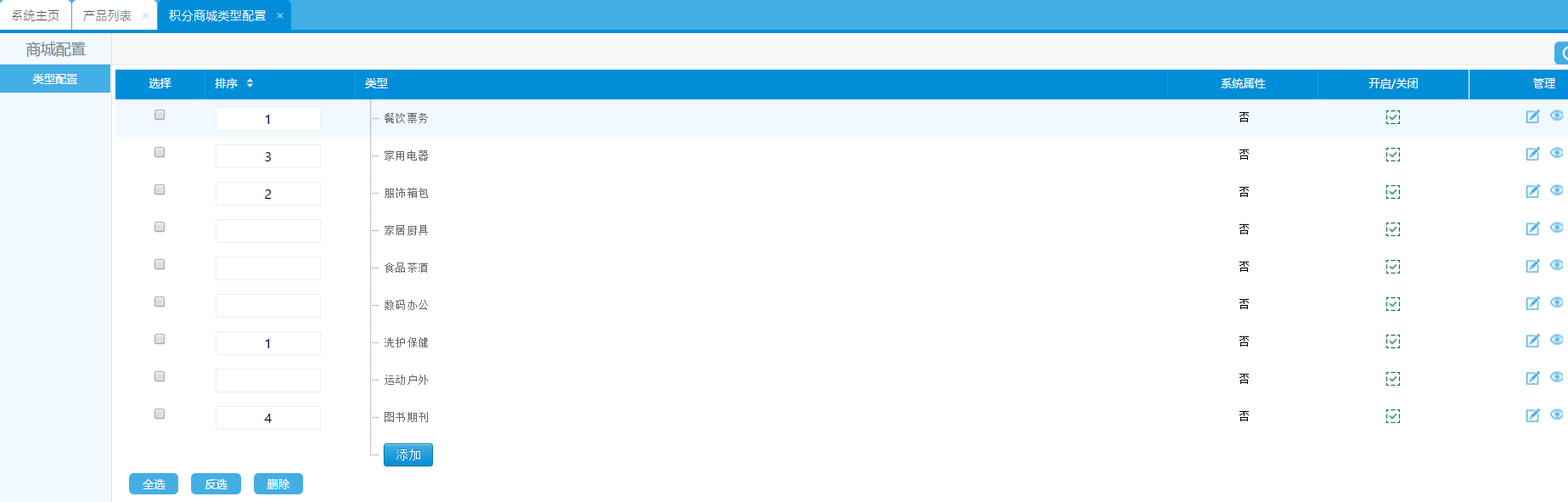 2、商城配置:用于商城所兌換產(chǎn)品的分類,僅支持一級