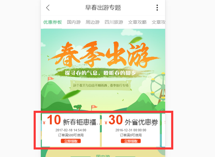 早春出游專題模板優惠券模塊需要購買優惠券應用才會有優惠券模塊展示(沒有購買不會展示)
