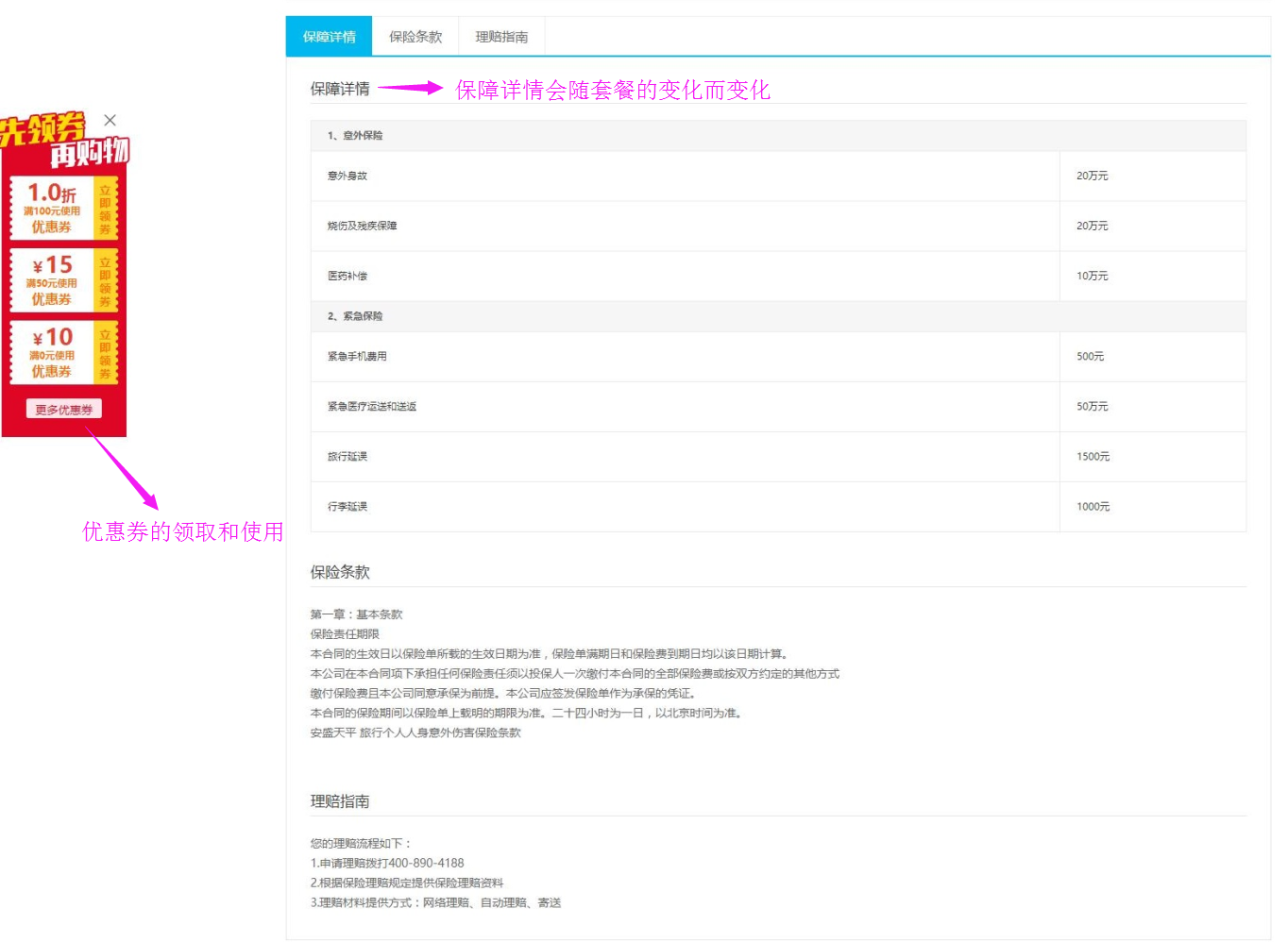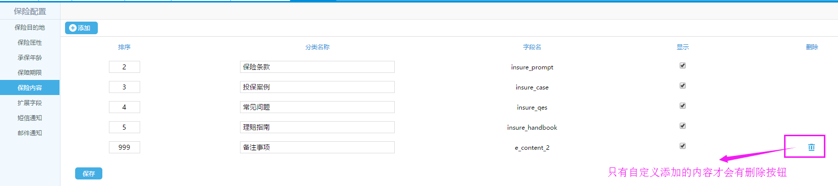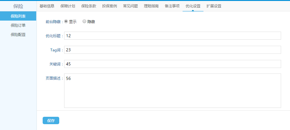 3、保險(xiǎn)條款、投保案例、常見問題、理賠指南:均為文本框,自定義編輯,若未填寫,前臺(tái)則不會(huì)顯示該欄目