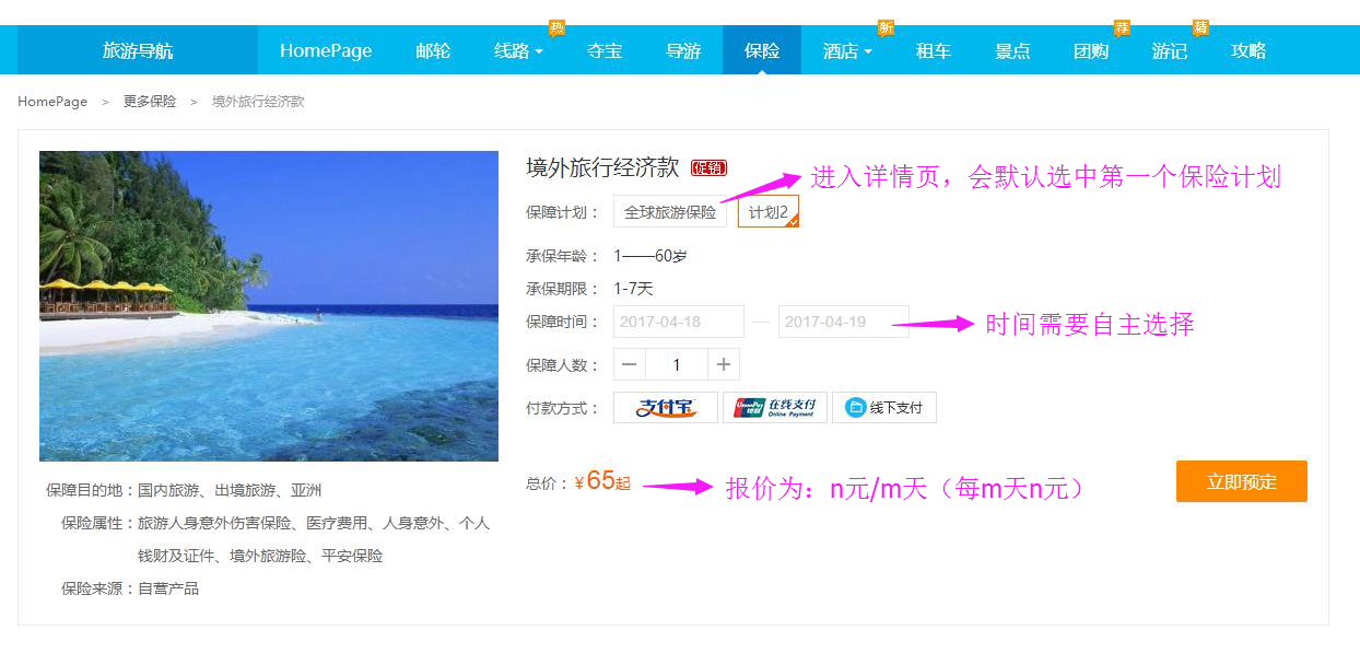 Eg:保險(xiǎn)報(bào)價(jià)為32元/2天,該線路的行程時(shí)間為3天,則64元/人;線路人數(shù)為2人,最終保險(xiǎn)價(jià)格則為64*2=128元
