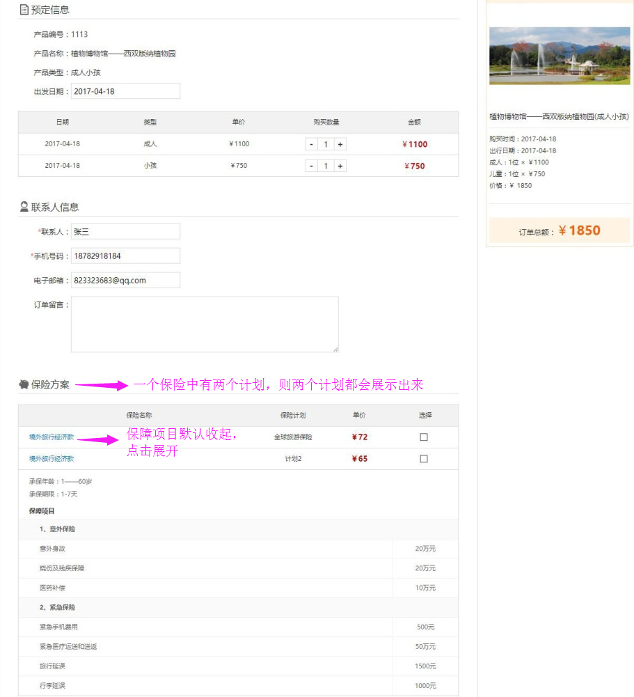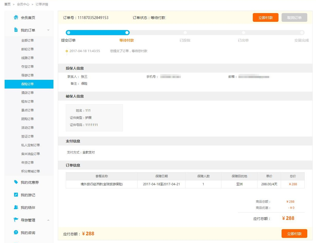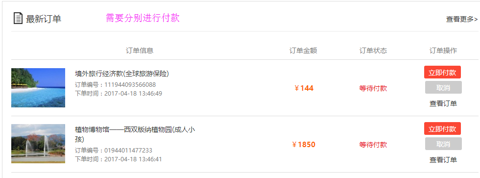 PS:線路預(yù)訂了保險(xiǎn)后,會(huì)生成兩個(gè)訂單,保險(xiǎn)訂單和線路訂單