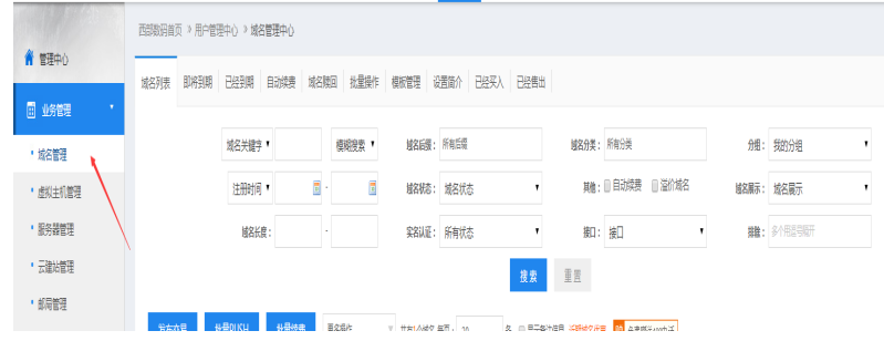 在購買域名的網(wǎng)站登陸注冊賬號和密碼,在左側(cè)的管理中心點擊域名找到購買的域名