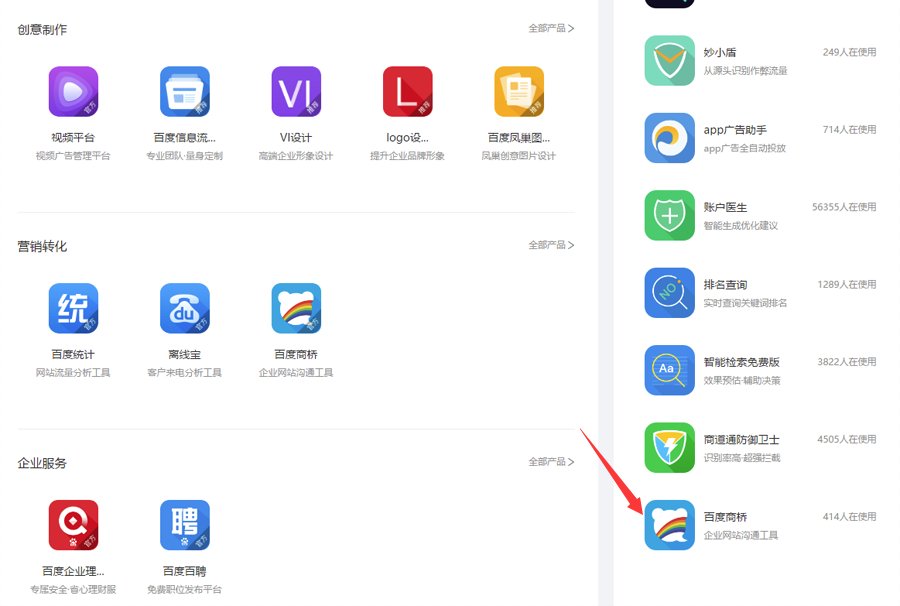 這樣我們就注冊好了百度推廣賬號,進入百度推廣賬號首頁,一直將頁面往下拉,可以看到百度商橋應用,安裝即可: