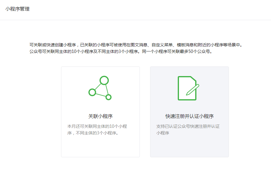 如果您原來已經(jīng)有了公眾號(hào),想要快速注冊(cè)小程序,也可以按下面流程操作(如果已有小程序賬號(hào)請(qǐng)忽略這一步,直接進(jìn)入小程序配置):