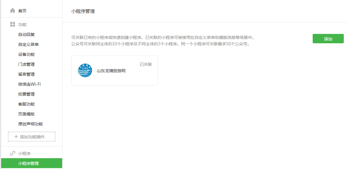 下圖是通過快速創(chuàng)建小程序后,公眾號(hào)平臺(tái)的展示效果,可以看到已經(jīng)顯示關(guān)聯(lián)上該小程序: