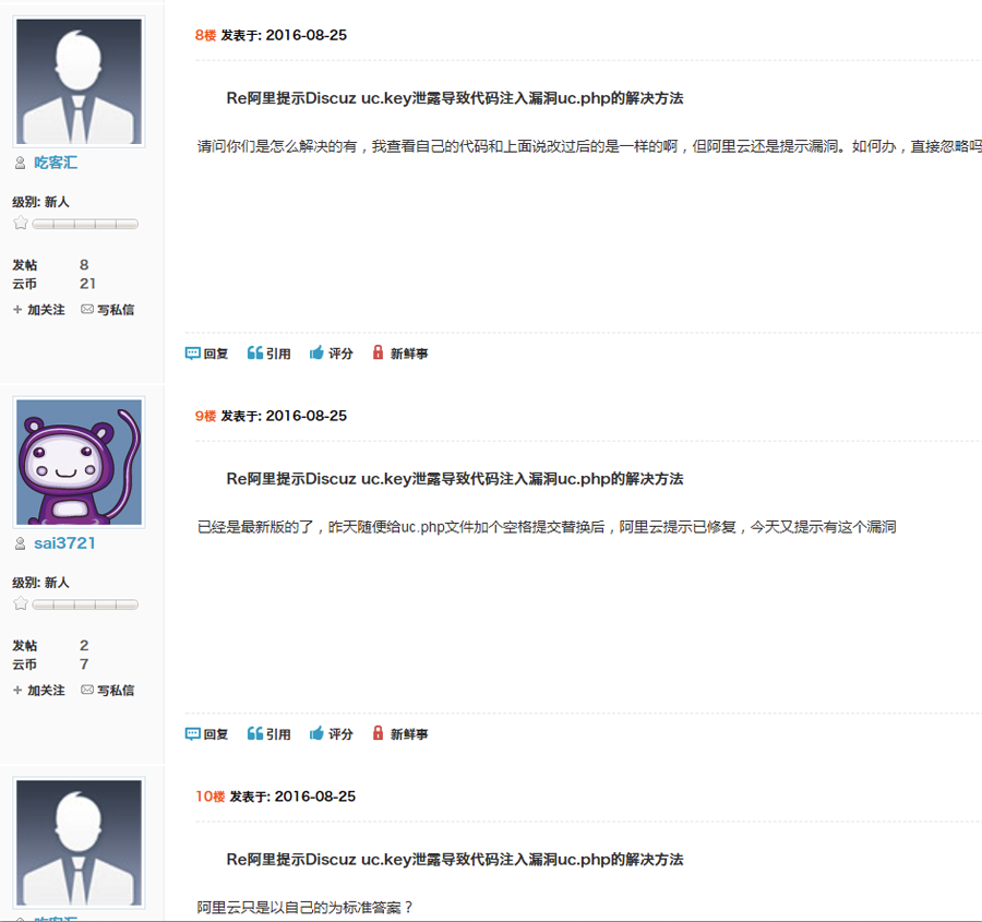 所以建議用戶可選擇忽略這個提醒,如果用戶沒有使用DISCUZ的Ucenter接口,可以將網站下的/api/uc.php更名,這樣也能避免這個提示,但是更名后將不能正常的使用discuz的相關整合功能,如ucenter?。