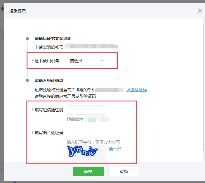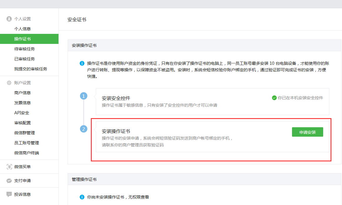 1.3注意:若您沒有安裝證書,需要先根據(jù)微信支付平臺的要求填寫信息,成功安裝微信支付證書。