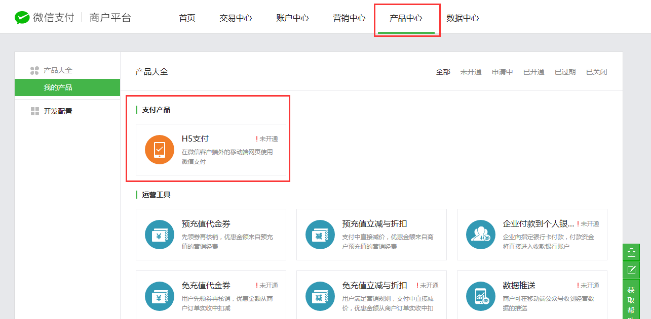 1.2在產(chǎn)品中心-支付產(chǎn)品中找到”H5支付”。點擊進行申請