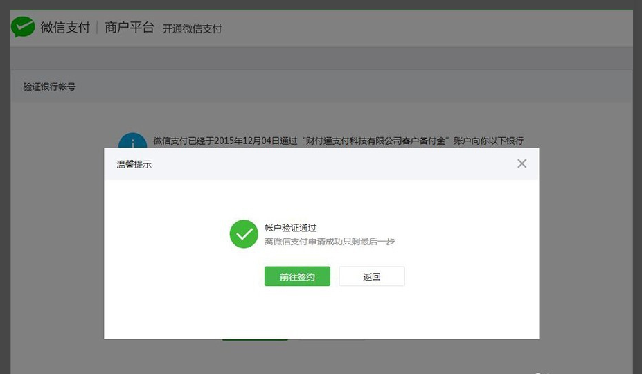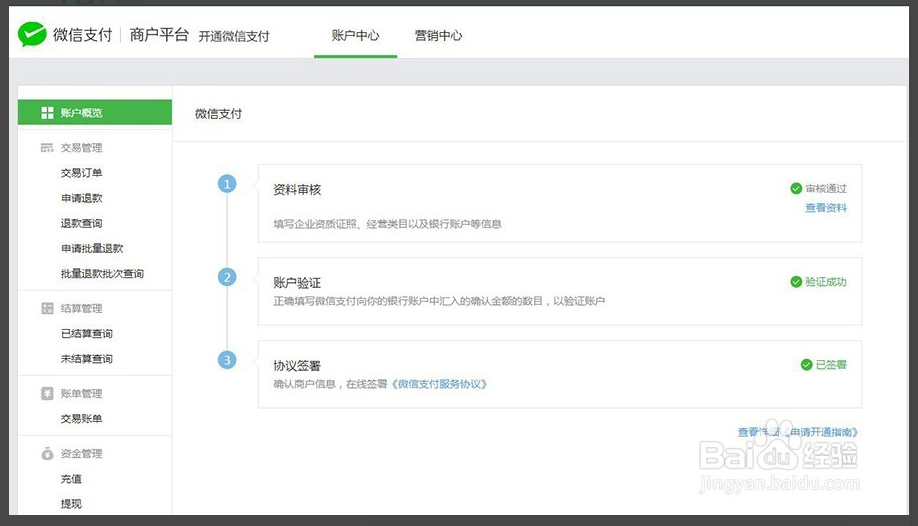 再回到微信支付商戶平臺,可以看到“資料審核”通過,“賬戶驗證”以成功驗證,“協議簽署”也已經簽署成功了。