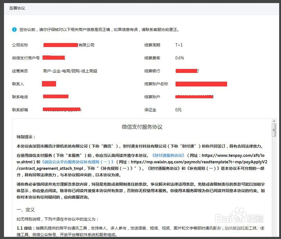 九、商戶平臺協議簽署——隨機款驗證完成后馬上會提示“前往簽約”,仔細閱讀微信支付服務協議,并確認商戶信息,沒問題后就同意協議,點擊簽署,就會提示已經完成微信支付的申請