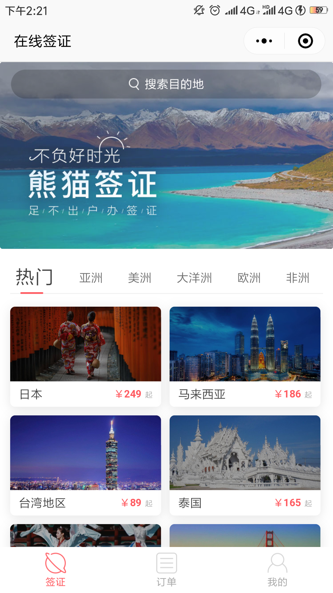 熊貓簽證是開創(chuàng)簽證電子化、系統(tǒng)化操作的先驅(qū),服務覆蓋99個國家及地區(qū)。游客可以直接通過這個小程序足不出戶,就能辦理簽證,使簽證資料電子化。