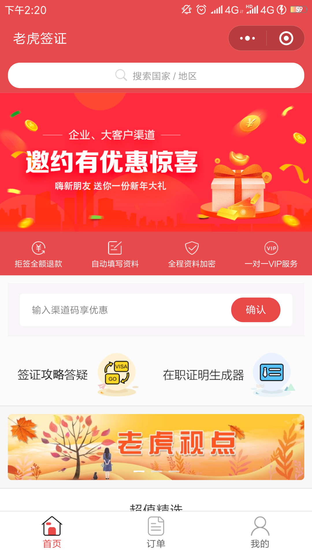該小程序的首頁,游客既可以查找簽證目的地,又可以在頁面的下方看到商家為簽證所提供的增值服務,同時還有多種簽證類型供你篩選適合自己的,大大滿足了游客的需求的多樣化。