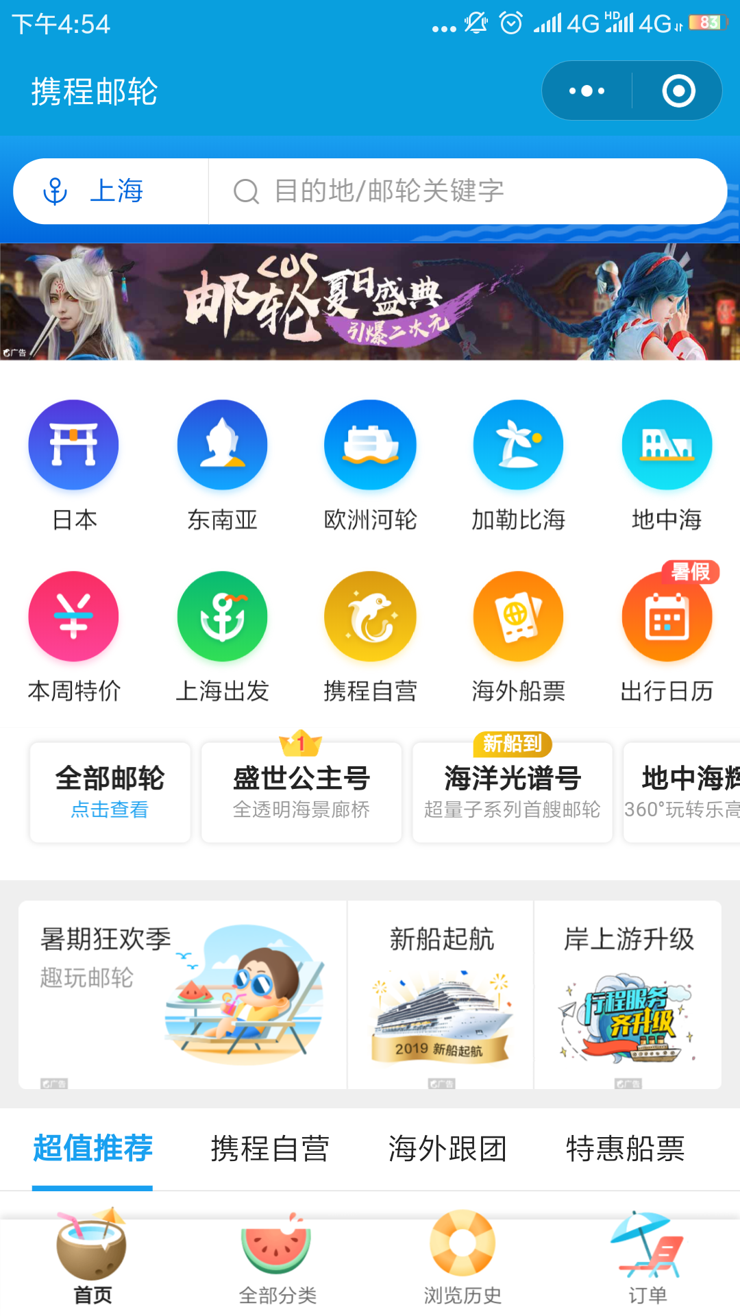 該小程序的頁面的設計特別小清新,采用了椰子、西瓜、游泳圈、沙灘躺椅卡通圖片做圖標,整個頁面與主題十分符合。導航欄上直接展示出熱門游玩目的地、特價活動、出行日歷;還可以顯示全部郵輪,有對該郵輪的介紹及其行駛的線路。繼續往下滑,還可以看到專對暑期做的活動以及游玩線路的推薦。總的來說,功能十分齊全。