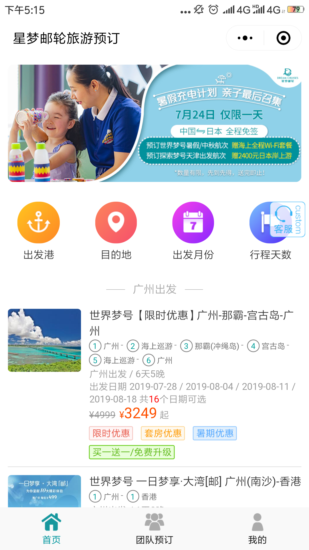 星夢郵輪是亞洲本土豪華郵輪品牌,專為中國及亞洲高端郵輪市場打造。旗下有著“云頂夢號”、“世界夢號”兩艘郵輪,故該小程序主要售賣的是這兩艘郵輪的游玩線路。在頁面可通過出發港、目的地、出發月份、行程天數來查找線路行程;同時,該小程序還可以直接接受團隊預訂。