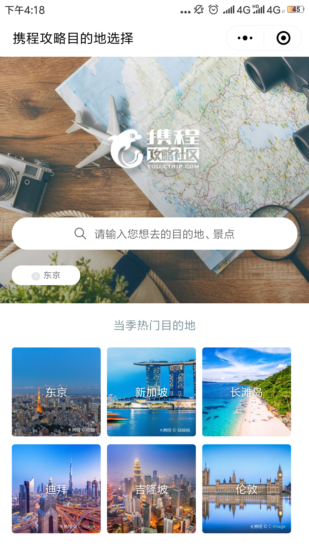 該小程序是直接通過輸入目的地、景點(diǎn)來獲取游玩的攻略,同時(shí)首頁還推薦了當(dāng)季熱門目的地。選擇游玩目的地,可以看到關(guān)于該景區(qū)的介紹,以及許多游客分享該目的地的一些攻略。可以說,整個(gè)頁面設(shè)計(jì)較為簡潔,一目了然。