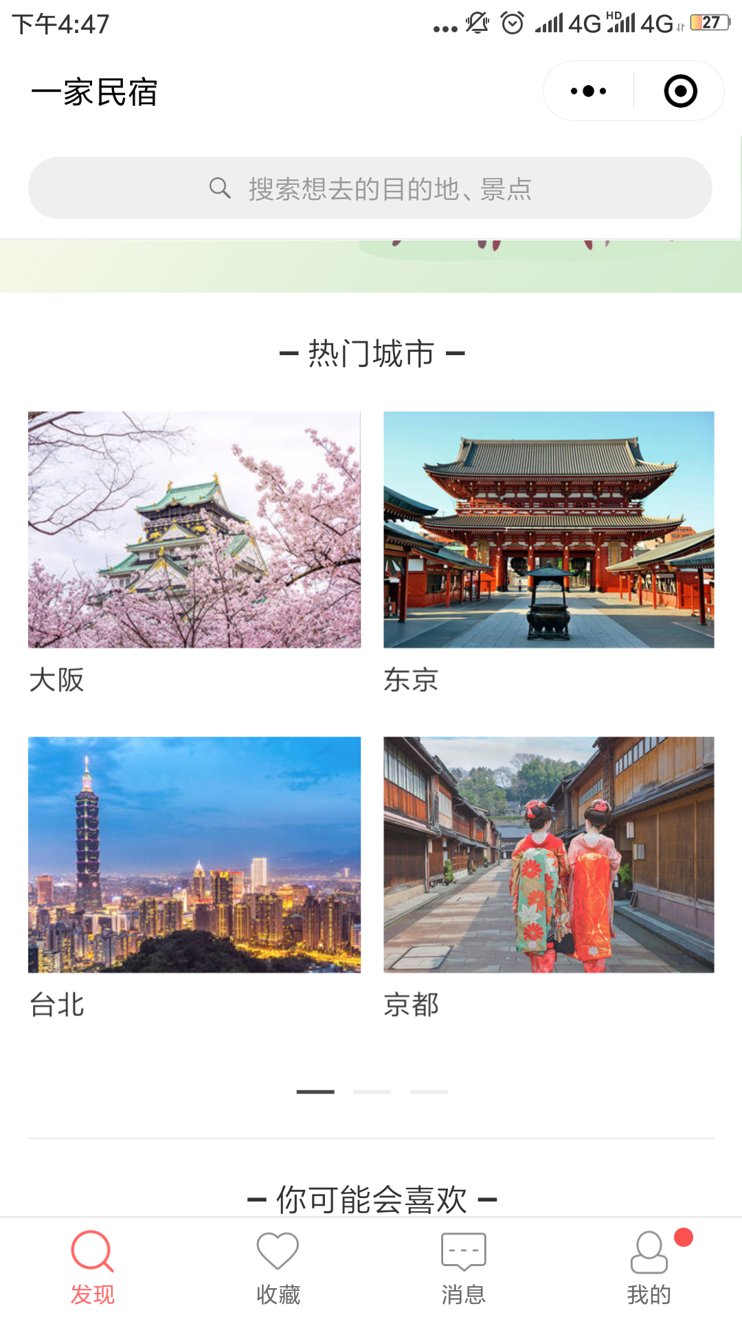 該小程序是全球華人民宿信息平臺,專注于海外。所以該小程序的模板首頁直接采用城市的圖片進行分類導航。點進某一個城市,可看到每一家民宿都采用了輪播圖展示住宿的環境,同時點擊右上角可進行收藏。總的來說,該模板的設計既貼心,又精美。