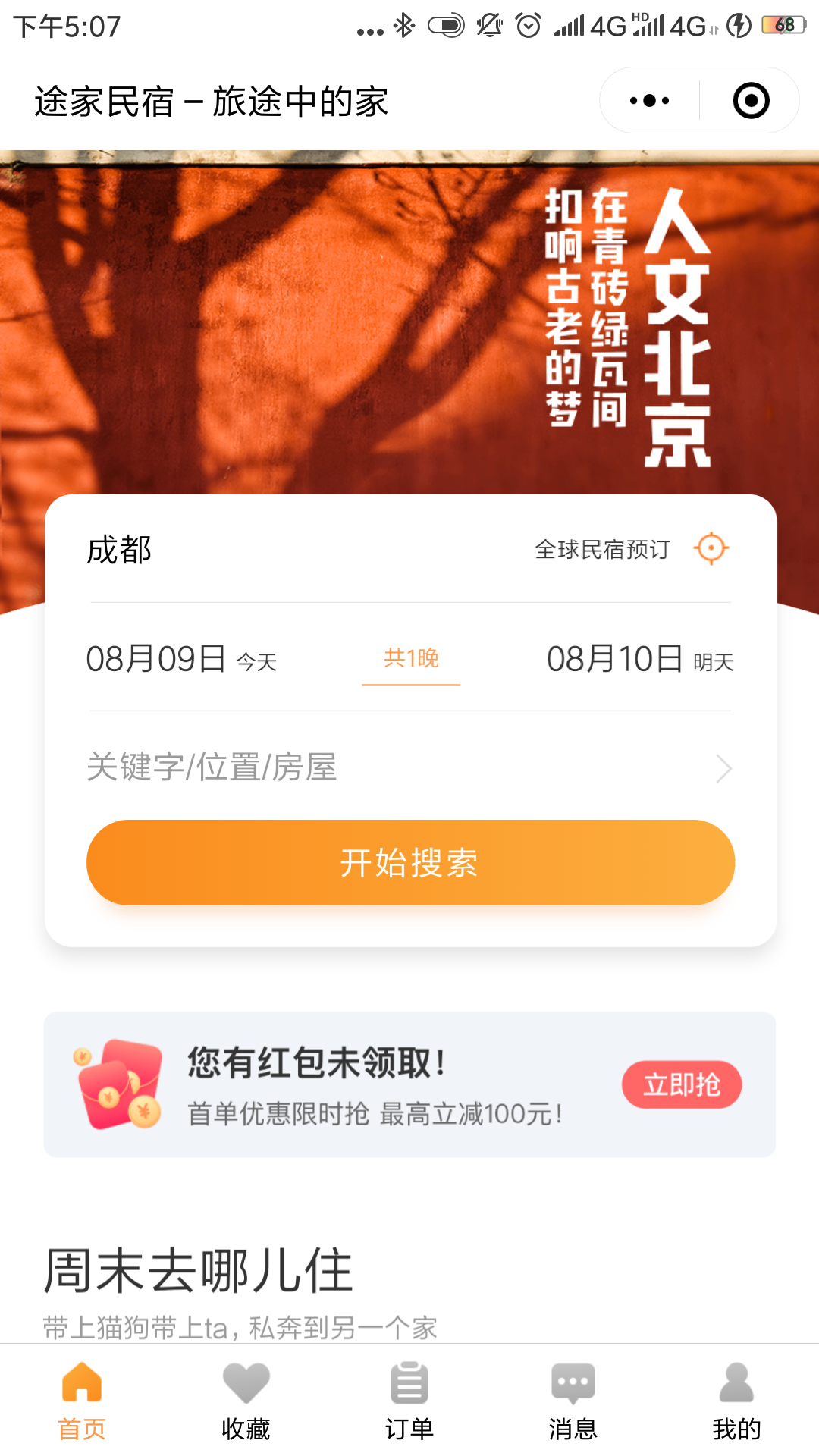 該平臺主打是特色民宿和短租房預訂,所以一打開頁面只有一個版塊:根據位置以及入住時間查找房源。然后在房源詳情頁可根據位置區域、周邊度假、家庭出游、商旅出行等多種情況進行選擇房源,同時在每一個城市都會有特價民宿推薦。