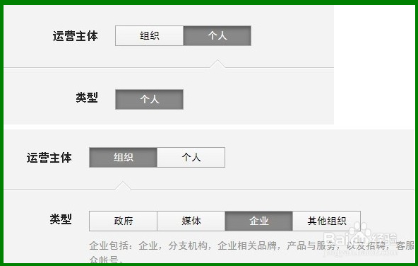 1、登記提交的資料不同。申請(qǐng)個(gè)人賬號(hào),最重要的是提交手持個(gè)人身份證的照片。申請(qǐng)組織,提交企業(yè)營(yíng)業(yè)執(zhí)照、注冊(cè)號(hào)、運(yùn)營(yíng)者手持身份證掃描件等更多資料。