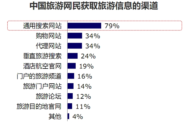以上是百度2014年統(tǒng)計的2013年整年中國網民獲取旅游信息的渠道統(tǒng)計圖。如圖所示,我們可以發(fā)現(xiàn)以下特點: