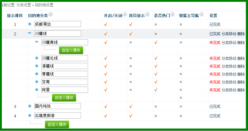 1、目的地分類是思途CMS的產(chǎn)品和信息分類主線,只有目的地開啟,對應(yīng)的產(chǎn)品或信息才可進(jìn)行分類關(guān)聯(lián);