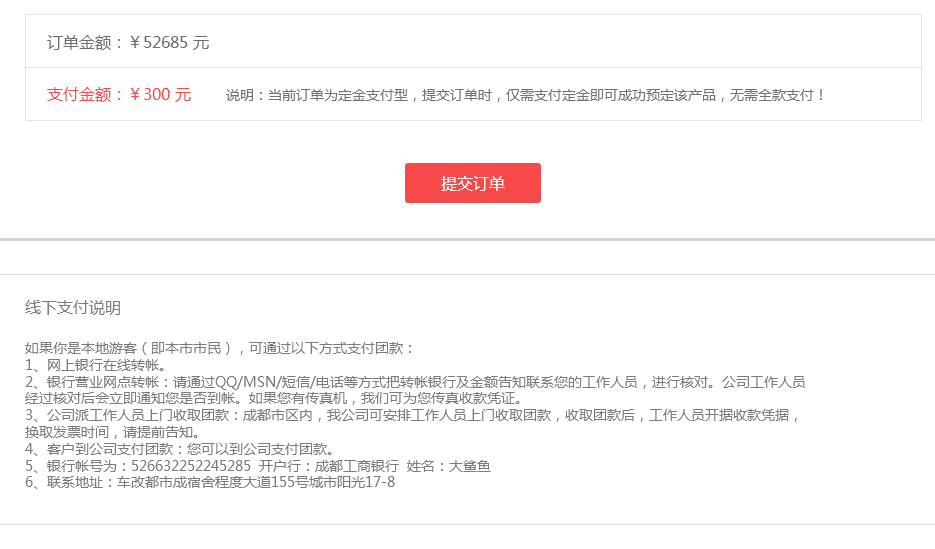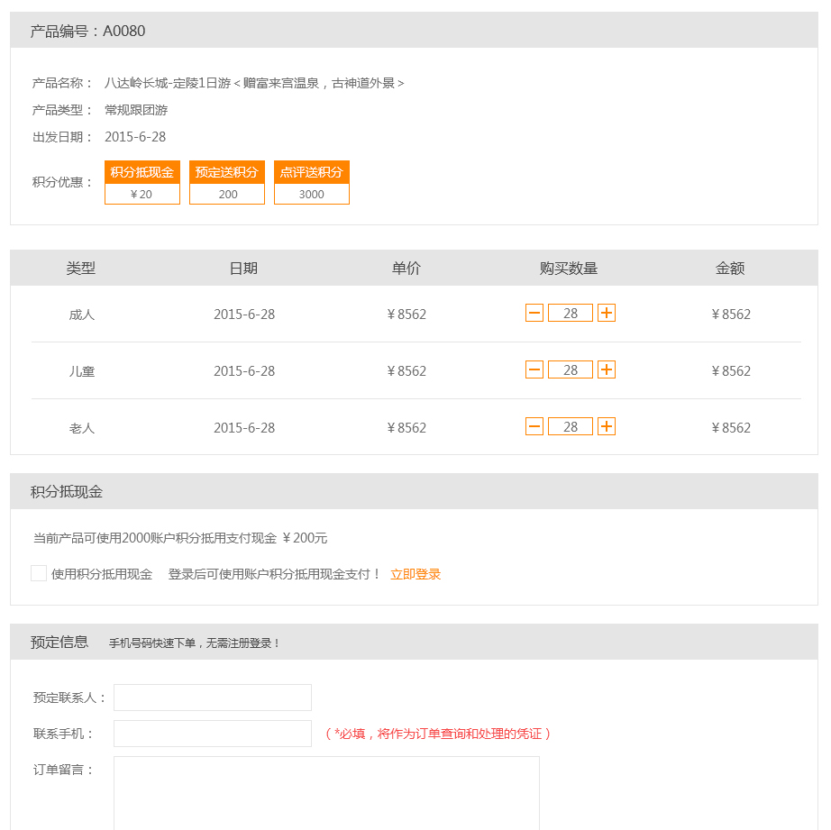全新的預(yù)定流程實(shí)現(xiàn)客戶快速預(yù)定和快速查詢,客戶無需注冊(cè)登錄填寫手機(jī)號(hào)碼即可成功預(yù)定產(chǎn)品,并增加了全站的線下支付和線下支付說明功能,方便客戶線下轉(zhuǎn)賬等多種付款方式。