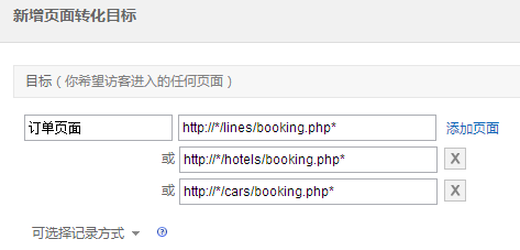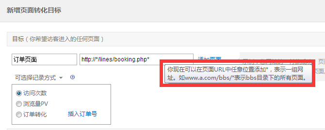 添加目標(biāo)頁面http://*/lines/booking.php* 紅色框里,說明了url的填寫方法:你現(xiàn)在可以在頁面URL中任意位置添加*,表示一組網(wǎng)址,如www.a.com/bbs/* 標(biāo)識(shí)bbs目錄下的所有頁面。