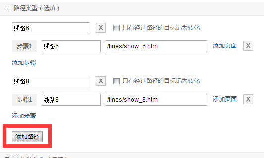 如我們的線路中有兩條線路/lines/show_6.html /lines/show_8.html是我們的重點(diǎn)線路,我們想記錄從這兩個(gè)線路頁面到線路訂購頁面的轉(zhuǎn)化。此時(shí),下面的路徑類型就我們要設(shè)置的重點(diǎn):