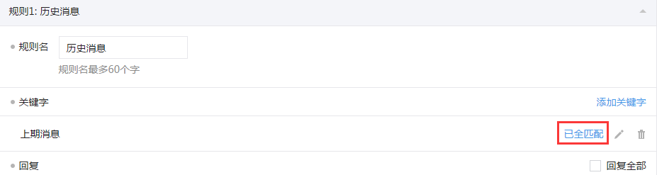 比如我們添加一個規(guī)則名為:歷史消息。添加關(guān)鍵字為:上期消息。回復(fù)內(nèi)容為兩張圖片,選擇“已完全匹配”,并且位勾選“回復(fù)全部”。