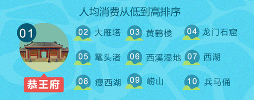 如果細(xì)化到具體景區(qū),恭王府、大雁塔、黃鶴樓、龍門(mén)石窟、黿頭渚、西溪濕地、西湖、瘦西湖、嶗山、兵馬俑是“十大良心景區(qū)”——它們都是5A級(jí)景區(qū),但人均消費(fèi)最少。