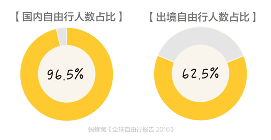關于自由行市場,報告顯示,隨著國內交通便利化和景點規范化的不斷提升,中國游客在國內旅游時更傾向于選擇自由行,2015年全國國內旅游人數超過40億人次,其中自由行人數達38.6億人次,占比達96.5%;出境游方面,2015年中國出境旅游人數達到1.17億人次,其中出境自由行人數近7313萬,占比62.5%。