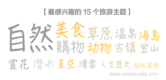 報告顯示,自然、美食、購物成為2016年自由行游客最感興趣的三大主題,然而隨著人民幣匯率變化和中國人消費心態的成熟,自然與美食超過購物成為旅行的主要魅力之源,獨特的當地體驗也占據重要位置。