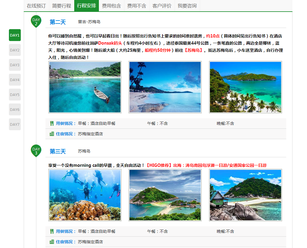 行程安排是對某條旅游產品的具體介紹,它直接決定了這條線路能不能吸引到游客。首先,行程介紹應該具體,不應該太簡略,像是一句話這種方式。第二,行程安排不能直接把某個景點介紹直接復制過來,游客實際需要的并不是這些景點的官方資料,他們想看的是這個景點為什么值得去?有什么亮點?與其息息相關的實用型內容才是他們最關注的。文字也不能過多,因為用戶耐心有限,不可能在某條線路上停留太長時間,而且重點部分應該予以標識,否則游客看了整條線路,一點重點也沒有。第三,很多旅游線路天數都比較長,用戶看下面時,有時候想回到某一天看看那一天的安排,需要自己滑動鼠標慢慢往回翻,非常麻煩,而如果左側有一個浮動天數標簽的話,則可以很好的解決這個問題,方便用戶,如下圖所示: