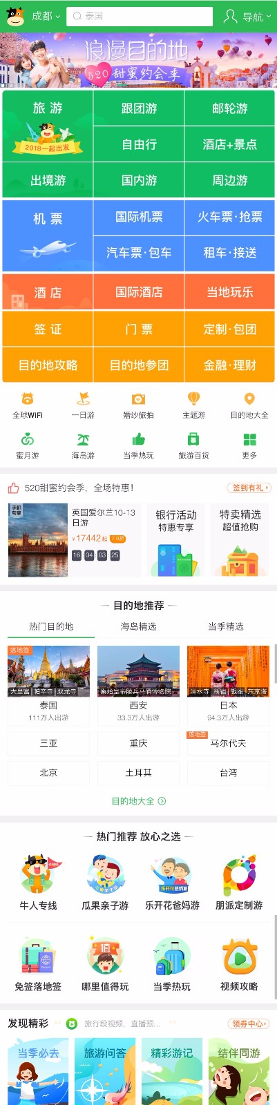 除了常規(guī)的目的地推薦、線路推薦,途牛的首頁還為游客提供了熱門主題推薦,以及發(fā)現(xiàn)精彩等多種多樣的功能,這些對于需求不明晰的消費者而言,可以提供各個方面的參考信息,非常的實在。面對如此精彩的信息庫,如果我們是正在做詳細功課的游客,會不會也深陷其中呢?