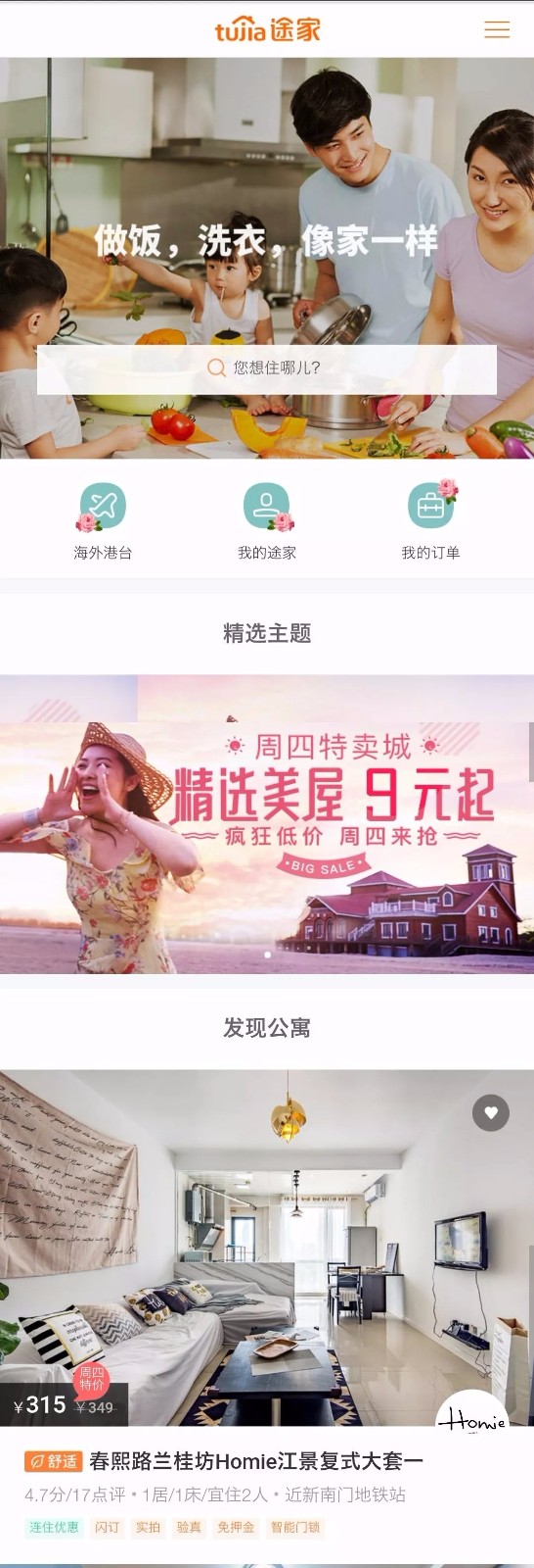 途家的手機頁面如同品牌名一樣,非常的溫馨,白色的基調、干凈的配色、簡潔的導覽、清新的配圖,無一不貼合著民宿的主題。途家的首頁分類只有簡單的三類,提高了用戶使用手機操作的便利性。首頁的產品推薦,也保持了精簡的關鍵詞,并通過貼標簽的方式,讓用戶能一眼注意到產品的關鍵信息,大大提高了用戶瀏覽的效率。