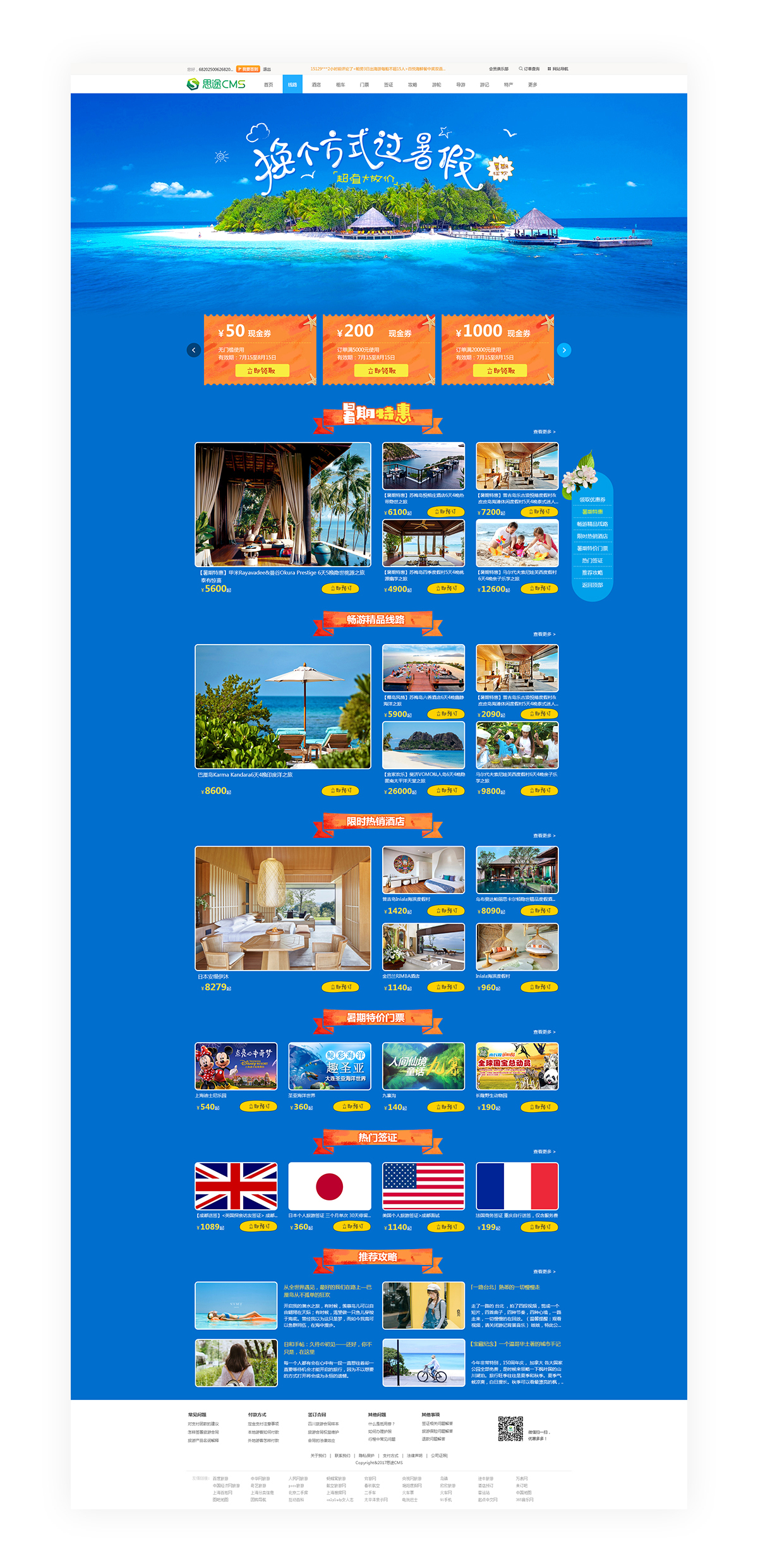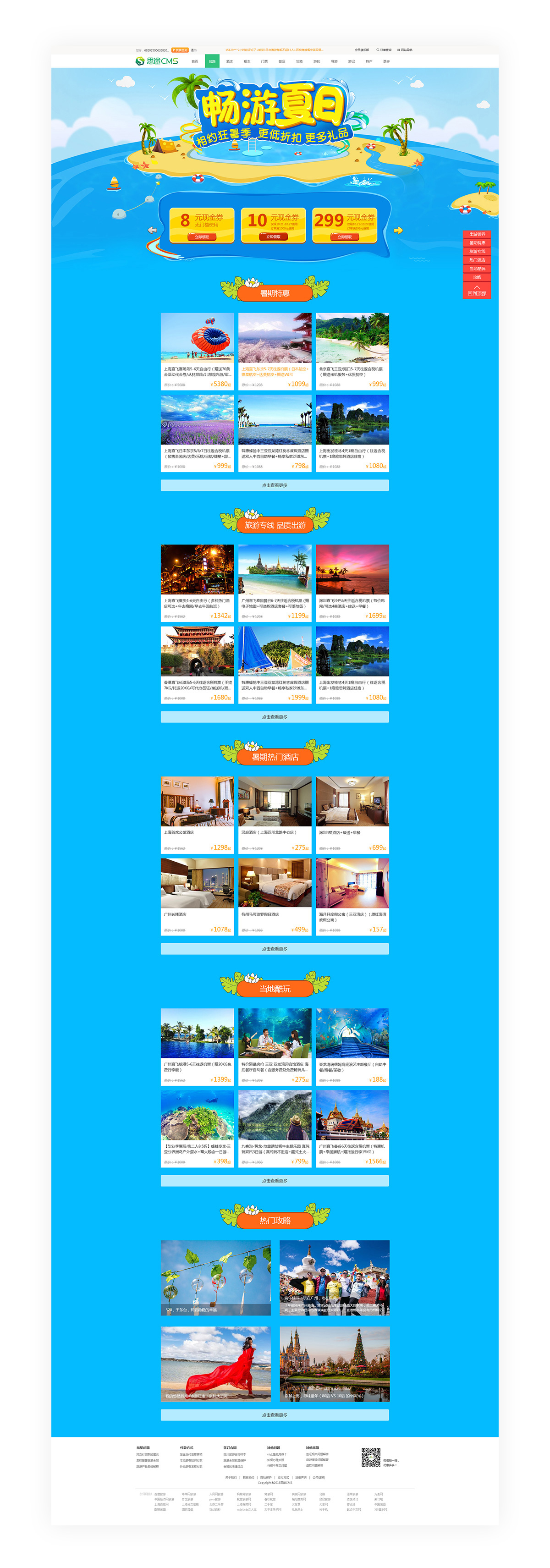 夏天,是人們出游的高峰期,出游第一件事,當然是打開旅游網站。不過,現在的旅游網站花樣別出,沒有自身特色,長期保持一個單調樣式,怎么能吸引游客們挑剔的眼光呢?所以,要想在這個夏天打一場漂亮的勝仗,還得有“靚衣”加身才行。為了幫助大家更好的凸顯假日特色,思途就為大家準備了幾款清新一夏的夏日模板。