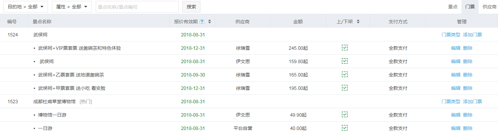 亮點一:【景點和門票功能拆分,支持一個景點由多個供應商供應門票的場景】